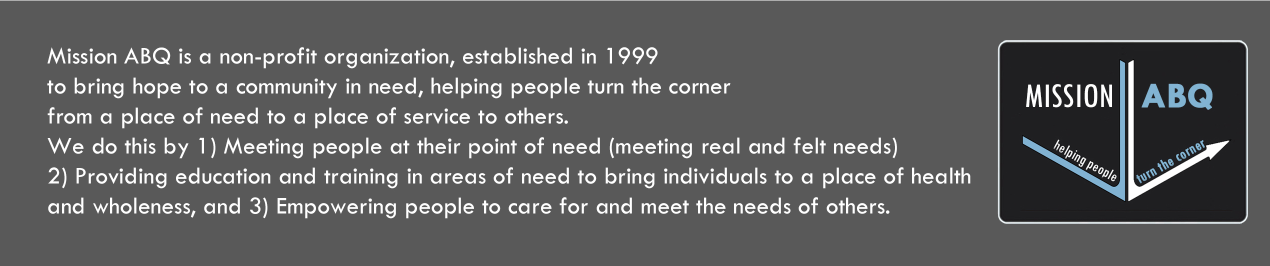 Mission ABQ is a non-profit organization, established in 1999 to bring hope to a community in need, helping people turn the corner from a place of need to a place of service to others. We do this by: